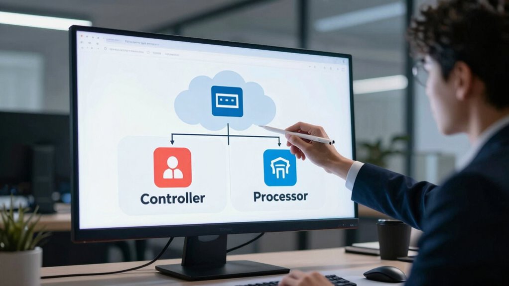In the cloud, your role under GDPR depends on your control over data and decision-making. If you set processing goals, decide how data is used, and own responsibilities, you act as a controller. If you follow instructions to process data on someone else’s behalf, you’re a processor. Cloud providers can be both, depending on their specific activities. To clarify your role and comply, understanding these distinctions will help guide your responsibilities and guarantee legal compliance. Continue to explore more insights ahead.