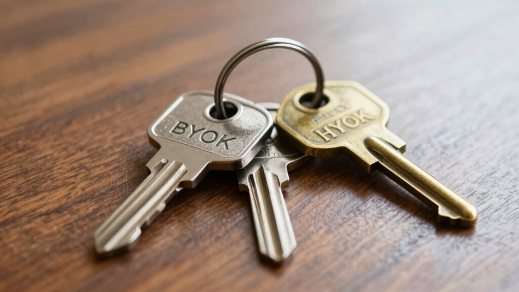 In BYOK, you generate and control your keys, sharing trust with your provider, which simplifies management but still leaves some exposure at the provider boundary. HYOK keeps your keys entirely in your infrastructure, giving you full control and stronger security, but it increases operational complexity and costs. Understanding who holds the keys shapes your security, compliance, and operational risks. If you want to grasp how this key ownership breakdown impacts your security strategy, there’s more to uncover ahead.