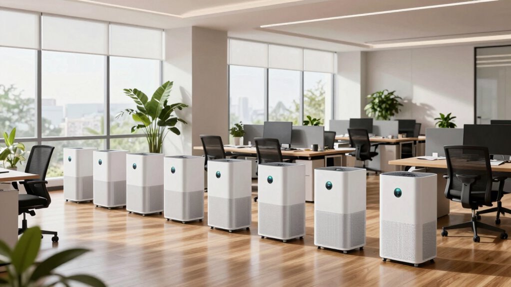 Did you know that high-quality air purifiers can remove up to 99.97% of airborne odors? I’ve found that these purifiers are highly effective at eliminating odors in large offices. They use activated carbon filters that trap smells from smoke, food, and pets, making the environment fresher. I recommend choosing models with powerful filters and high CADR ratings to guarantee your entire office stays odor-free and comfortable.