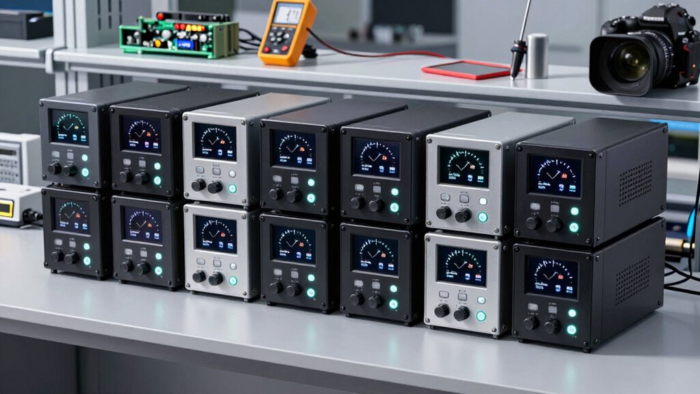 Accurate voltage control is critical when working with high-wattage power supplies, especially for sensitive electronics. I look for models with at least 0.01V resolution to make precise adjustments easily. Digital displays that show real-time voltage readings help me monitor and fine-tune outputs quickly, guaranteeing my experiments stay on track. Adjustable regulation with both coarse and fine controls allows for exact voltage settings, which is essential when dealing with delicate components. Low ripple noise and stable voltage outputs are also necessary, as they minimize interference and keep my circuits running smoothly. Additionally, programmable memory settings streamline complex testing procedures, letting me quickly recall precise voltage levels without manual reconfiguration. These features collectively assure my power supply provides the accuracy needed for high-wattage, precision work.