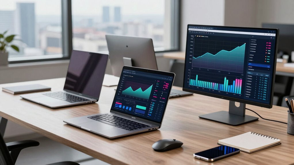 What security features are essential for IT managers’ laptops? I believe robust encryption, biometric authentication like fingerprint or facial recognition, and hardware-based security modules are critical. Do you want to protect sensitive data effectively? I always look for laptops with TPM chips, secure boot options, and remote wipe capabilities. These features guarantee my devices stay safe from threats, giving me peace of mind in managing sensitive business information.