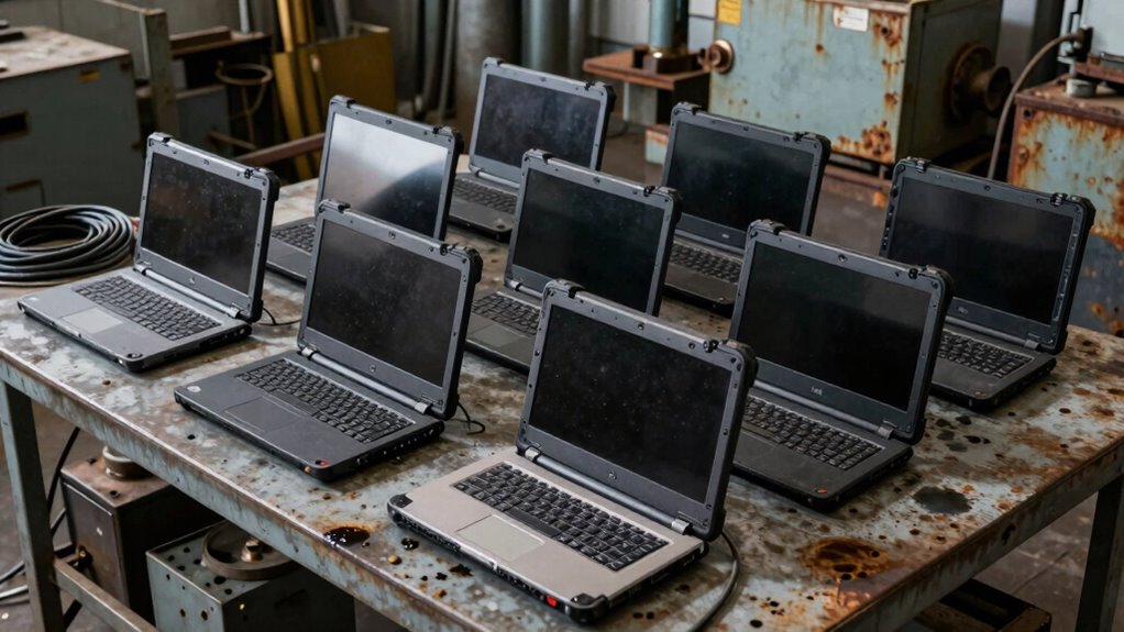 If you’re looking for reliable durable laptops for tough industrial environments in 2026, I’ve found 11 top options. These fully rugged devices meet military standards, resist water, dust, and shocks, and feature powerful processors, long-lasting batteries, and high-brightness screens for outdoor use. They come with various connectivity options and certifications to guarantee performance in demanding conditions. Stay with me to discover the best choices tailored for your industrial needs.
