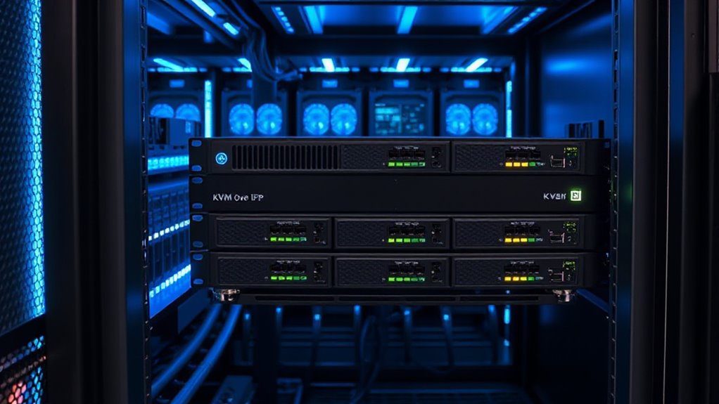 Choosing a KVM over IP device that seamlessly works with your existing hardware is vital for effective management. First, verify it supports your server’s interfaces, such as VGA, DVI, HDMI, or DisplayPort, to avoid compatibility issues. Next, confirm that it works with your server’s BIOS and firmware, enabling BIOS-level control and full boot management. Ensure compatibility with your operating systems, whether Windows, Linux, or Unix, so you can manage all servers without hassle. It’s also imperative to check that the device integrates with your network infrastructure, supporting standard Ethernet protocols and security features like AES encryption. Finally, consider if it offers daisy chaining or expansion options, which help you efficiently manage multiple servers within your rack setup.