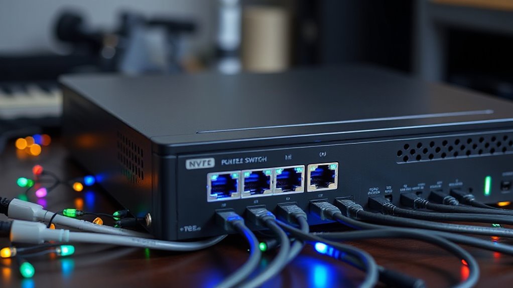 PoE power capacity is a critical factor to contemplate because it determines how many devices your NVR’s built-in switch can support simultaneously. This capacity is measured in watts (W), reflecting the total power the switch can supply across all connected devices. A higher PoE wattage means you can power more cameras at once or support cameras with higher power needs. Standard PoE (IEEE 802.3af) provides up to 15.4W per port, while PoE+ (IEEE 802.3at) offers up to 30W per port. Some switches have a total PoE budget, like 65W or 120W, limiting the combined power output across all ports. Ensuring your switch has adequate PoE capacity prevents overloads and guarantees stable operation for multiple high-power cameras.