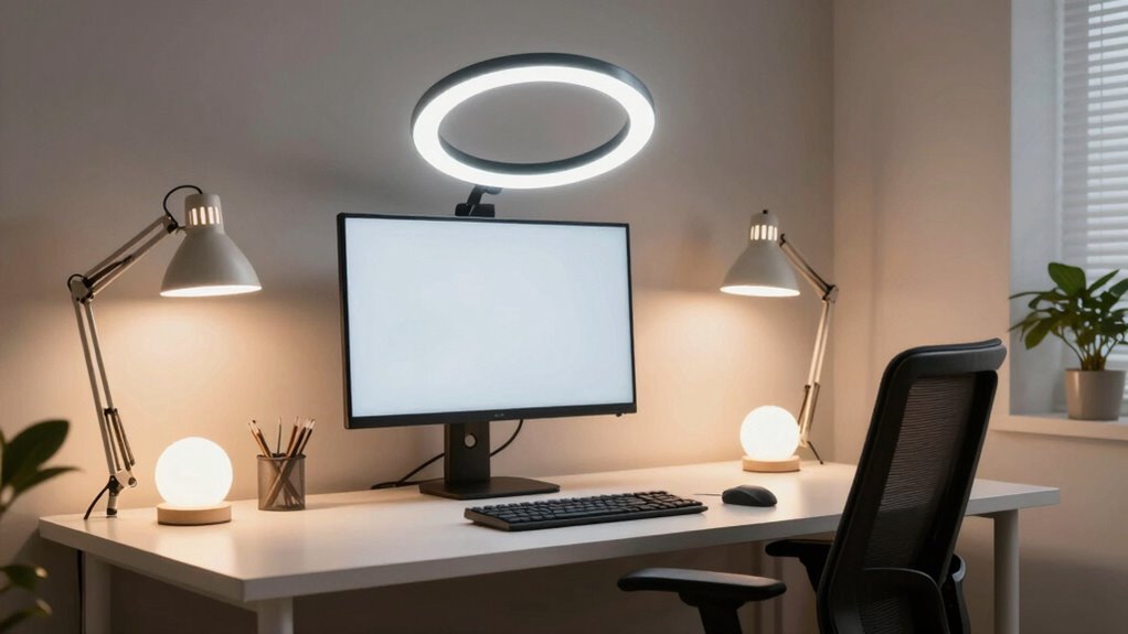 When selecting office lighting for video calls, I focus on brightness and adjustable settings to guarantee my face is well-lit without being harsh. I also consider color temperature options to create a natural look and minimize shadows, while making sure the setup works seamlessly with my devices. Proper control over glare and shadows makes a big difference in maintaining a professional appearance on camera.