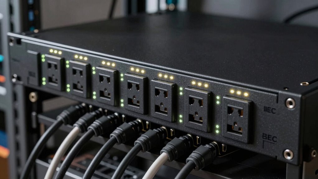 In environments with mixed equipment, having diverse connectivity options on a rackmount IEC power distribution unit can make a significant difference. Including USB ports and individual outlet switches improves device management and charging flexibility, helping streamline operations. Incorporating multiple outlet types, like IEC, NEMA, and USB, ensures compatibility with a wide range of gear within a single unit. Features such as LED indicators and remote monitoring enhance visibility and control, making it easier to track device status remotely. Surge protection and circuit breakers safeguard connected equipment against electrical faults, reducing downtime. Flexible configurations, including rear- and front-facing outlets, facilitate easier installation and cable management, especially in complex rack setups. This variety of connectivity options guarantees your power distribution setup is adaptable, efficient, and reliable for mixed gear environments.