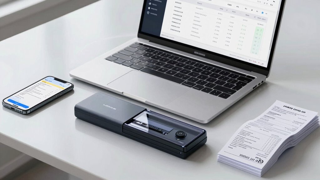 Choosing the right receipt and invoice scanner involves more than just software features; portability and size play a key role in how effectively your team can use the device across various settings. Portable scanners typically weigh between 1.5 to 2.6 pounds, making them easy to carry during on-the-go tasks. Compact models measure around 11 to 14 inches long, fitting comfortably on small desks or in luggage. Foldable document feeders help reduce overall size without sacrificing scanning capacity. Wireless and battery-powered options eliminate the need for constant power sources, boosting mobility. Additionally, their small footprint allows for easy storage in backpacks, briefcases, or drawers. Prioritizing portability guarantees your team can scan invoices and receipts efficiently, whether in the office, in the field, or on business trips.