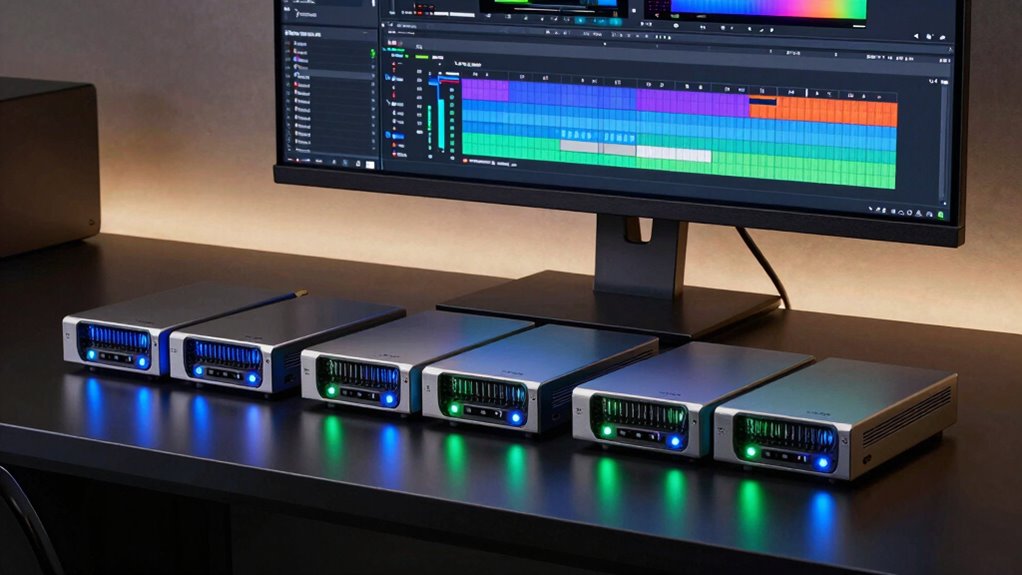 Ever wonder what transfer speeds are necessary to keep your video editing smooth and efficient? For 4K or higher resolution editing, a Thunderbolt RAID array should deliver at least 1000MB/s. RAID 0 configurations can maximize speed, making them ideal for high-bandwidth workflows. If you’re working with large video files routinely, aiming for sustained transfer speeds over 1500MB/s is even better. Thunderbolt 3 and 4 interfaces can provide up to 40Gbps bandwidth, supporting these demanding data rates. Understanding your specific workflow’s data needs helps determine whether a faster RAID array will genuinely improve your editing process. Ultimately, matching your storage speed to your project requirements ensures seamless playback, quick renders, and efficient editing sessions.