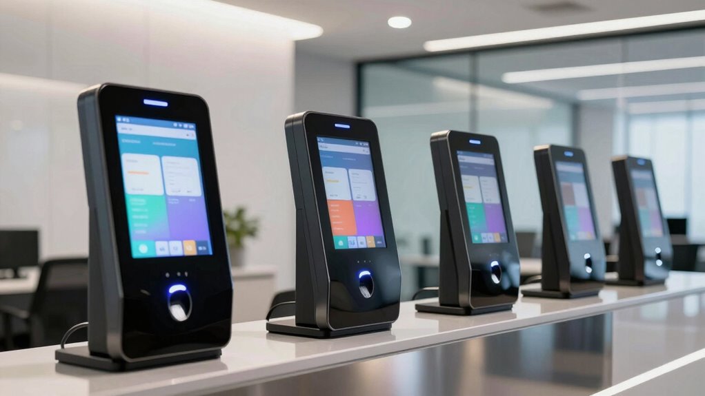 Choosing the right biometric verification method for a time clock terminal involves evaluating several key factors to guarantee accuracy, security, and user convenience. Fingerprint scanning remains popular because it’s reliable, fast, and affordable. It works well in most environments and is easy for employees to use daily. Facial recognition offers a contactless option, which is ideal for hygiene and quick identification from a distance, making it suitable for high-traffic areas. Palm print and iris scanning provide higher security but can be more costly and complex to implement. Voice recognition is another contactless method, though it may be affected by background noise. Multi-modal systems, combining methods like fingerprint and RFID, boost accuracy and security. Ultimately, your choice depends on your environment, security needs, and ease of use.