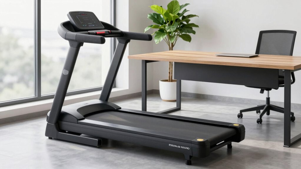 Adjustable incline and speed features are essential for customizing your workout and maximizing the benefits of your under-desk treadmill. Look for models with multiple incline levels, like 0-8% or up to 12%, to increase intensity and calorie burn. A speed range of at least 0.5 to 4.0 mph is ideal, allowing you to walk, jog, or do light running without disrupting your work. Quick and easy control over these settings via remote or app is a big plus, enabling seamless progression during your activity. Multi-level incline options can simulate uphill walking or hiking, boosting cardiovascular benefits. Ultimately, choose a treadmill with personalized incline and speed controls so you can tailor workouts to your fitness level and goals, ensuring effective, engaging exercise sessions.